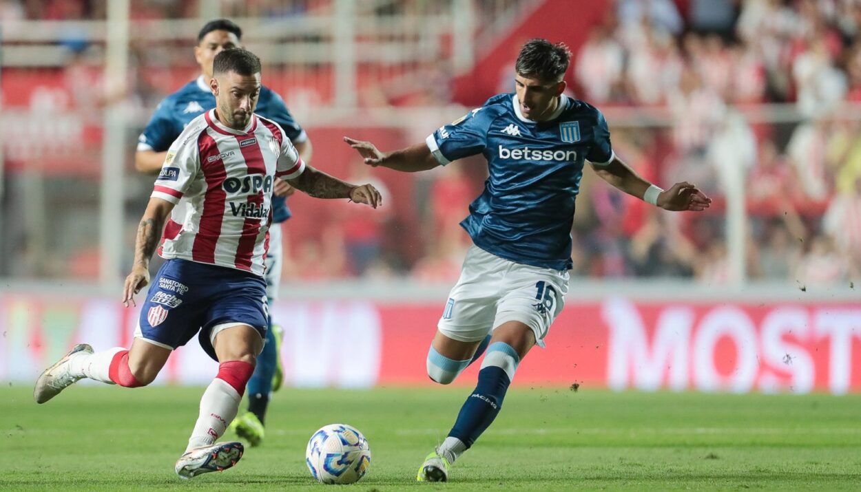 En los primeros minutos, el equipo de Costas fue el que puso la pelota al piso para darle un manejo prolijo al balón mientras que a Unión le costó acoplarse en el primer tramo del cotejo, sobre todo porque por momento abusó del pelotazo frontal buscando a Estigarribia y a Dómina, pero con el correr del reloj los de la Avenida López y Planes se acomodaron mejor de mitad de cancha hacia adelante con un trabajo prolijo y ordenado de Fragapane y la movilidad constante de los delanteros que complicaron constantemente a los flojos centrales de Racing, sobre todo a Sosa.