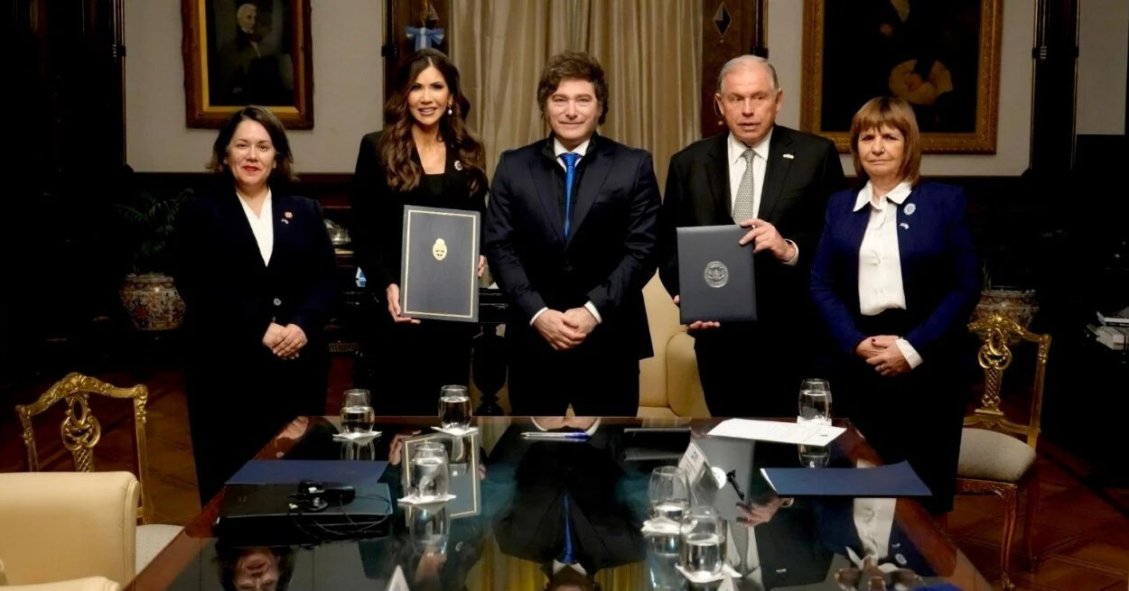 Tras haber llegado a última hora desde los Estados Unidos este domingo, la secretaria de Seguridad de ese país, Kristi Noem, estuvo esta mañana de lunes en Casa Rosada con el presidente Javier Milei; el canciller Gerardo Werthein, y la ministra del área, Patricia Bullrich, junto a otras autoridades de ambos gobiernos. La funcionaria de Donald Trump hizo una breve visita guiada por el Patio de las Palmeras y otros lugares de la sede del Poder Ejecutivo Nacional, en compañía de su par, con la que poco después -en el Salón Sur- firmó acuerdos para avanzar con la Visa Waiver.
