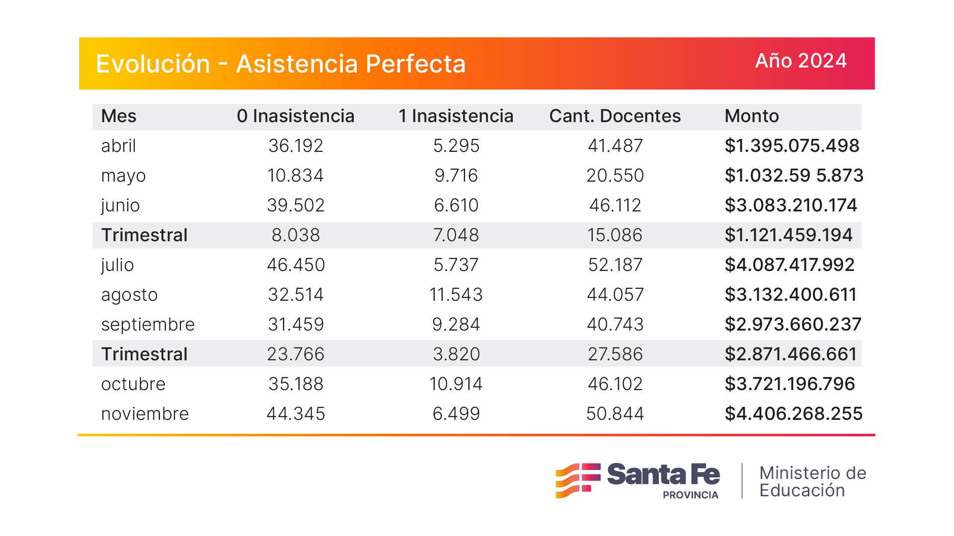 Cabe destacar que en noviembre, 44.345 docentes no registraron ninguna inasistencia y 6.499 sólo tuvieron una falta, y para ese mes el monto de inversión total del incentivo fue de $ 4.406.268.255.