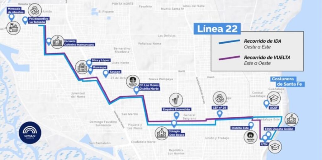 La 22 atravesará Santa Fe de oeste a este y pasará por lugares estratégicos como los hospitales Mira y López, Sayago y el Nuevo Iturraspe y dos universidades como la Católica y la Tecnológica, entre otros. Esta línea contará con una flota permanente de cinco coches y se estima que la frecuencia será de quince minutos.