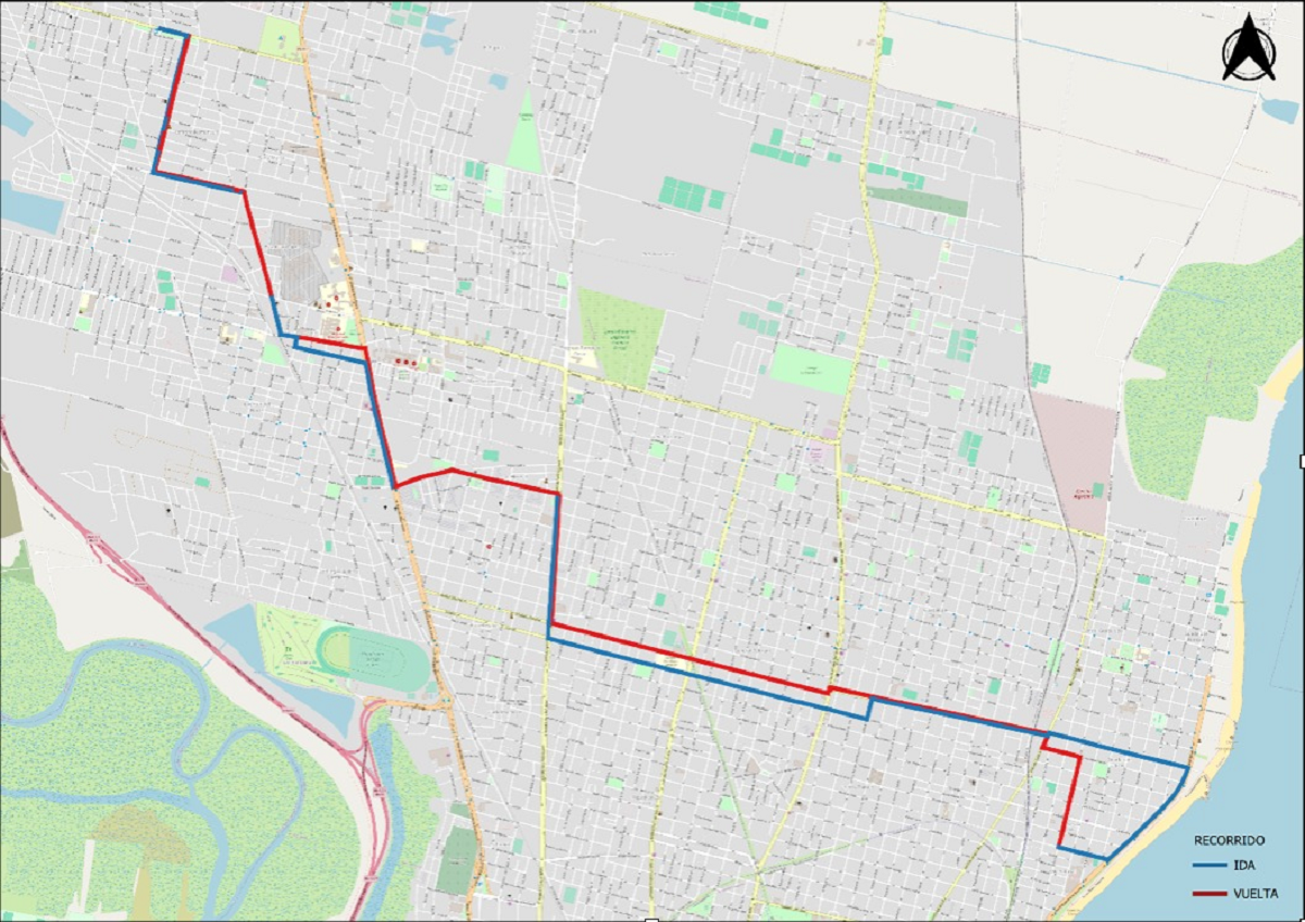 Recorrido: Teniente Loza – Av. 12 de Octubre – Hugo Wast – Cafferata – Beruti – Edmundo J. Rosas – French – Av. Blas Parera – Millán Medina – Regimiento 12 de Infantería – Av. Peñaloza – Castelli – Belgrano – Av. Galicia – Av. Gral. Paz – Obispo Boneo – Av. Almirante Brown – Pedro de Vega – Piedras – Estanislao Zeballos – Av. Gral. Paz – Av. Galicia – Av. Aristóbulo del Valle – Estanislao Zeballos – Av. Peñaloza – Regimiento 12 de Infantería – Millán Medina – Av. Blas Parera – Beruti – Cafferata – Hugo Wast – Av. 12 de Octubre – Teniente Loza.