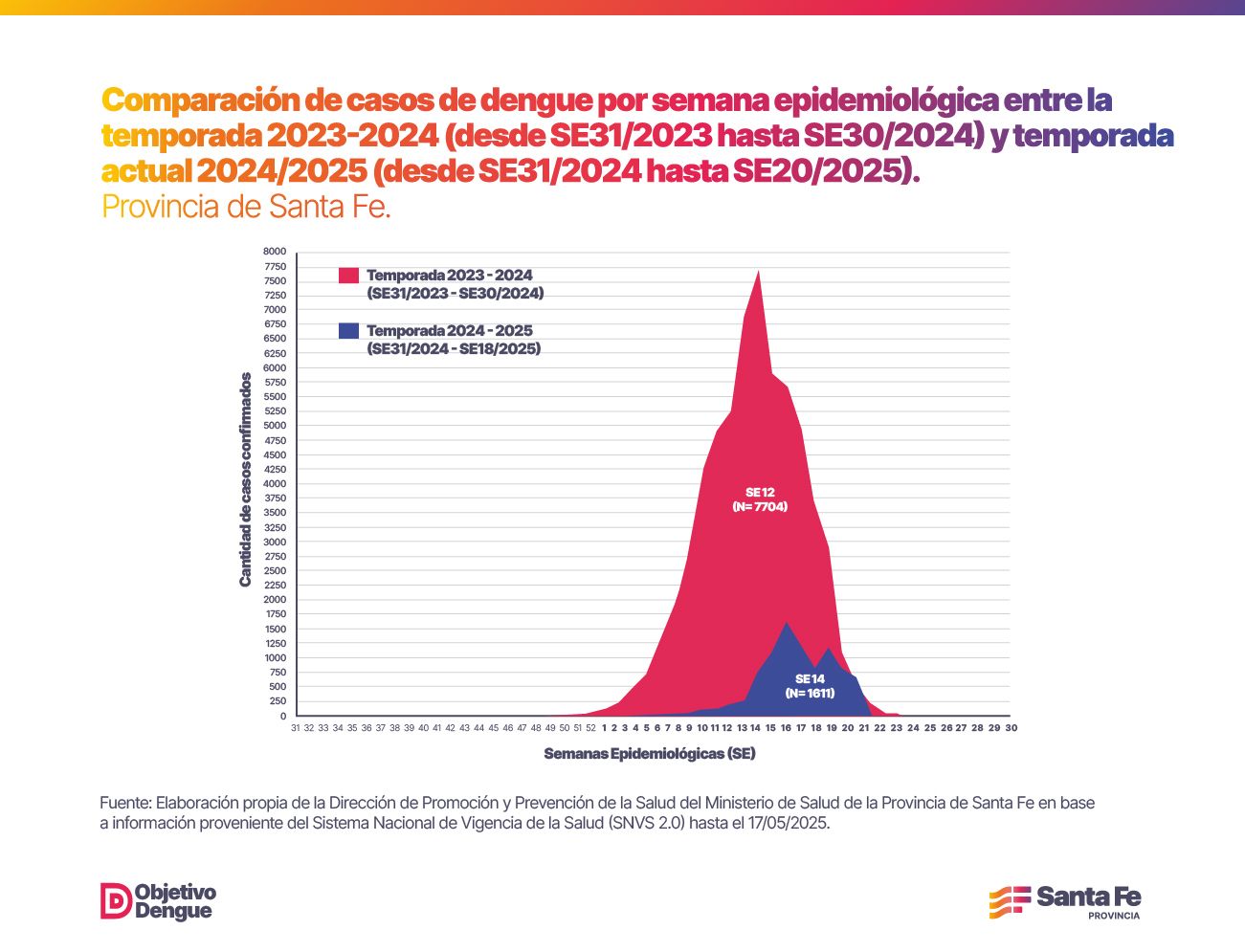 En lo que va de la temporada 2024-2025, la provincia de Santa Fe confirmó 9.084 casos de dengue, lo que representa una disminución superior al 85 % respecto a los 61.532 casos registrados en igual período de la temporada anterior.