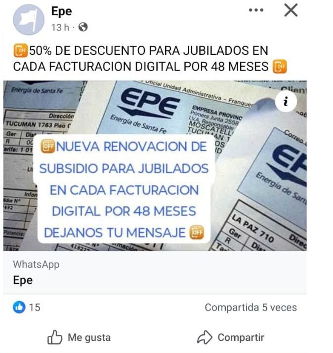 Personal de la Empresa Provincial de la Energía (EPE) ha tomado conocimiento que circulan en redes sociales publicaciones engañosas con beneficios exagerados para los usuarios, fundamentalmente jubilados. Esto se suma a otros intentos de estafas vía whatsapp o correo electrónico.